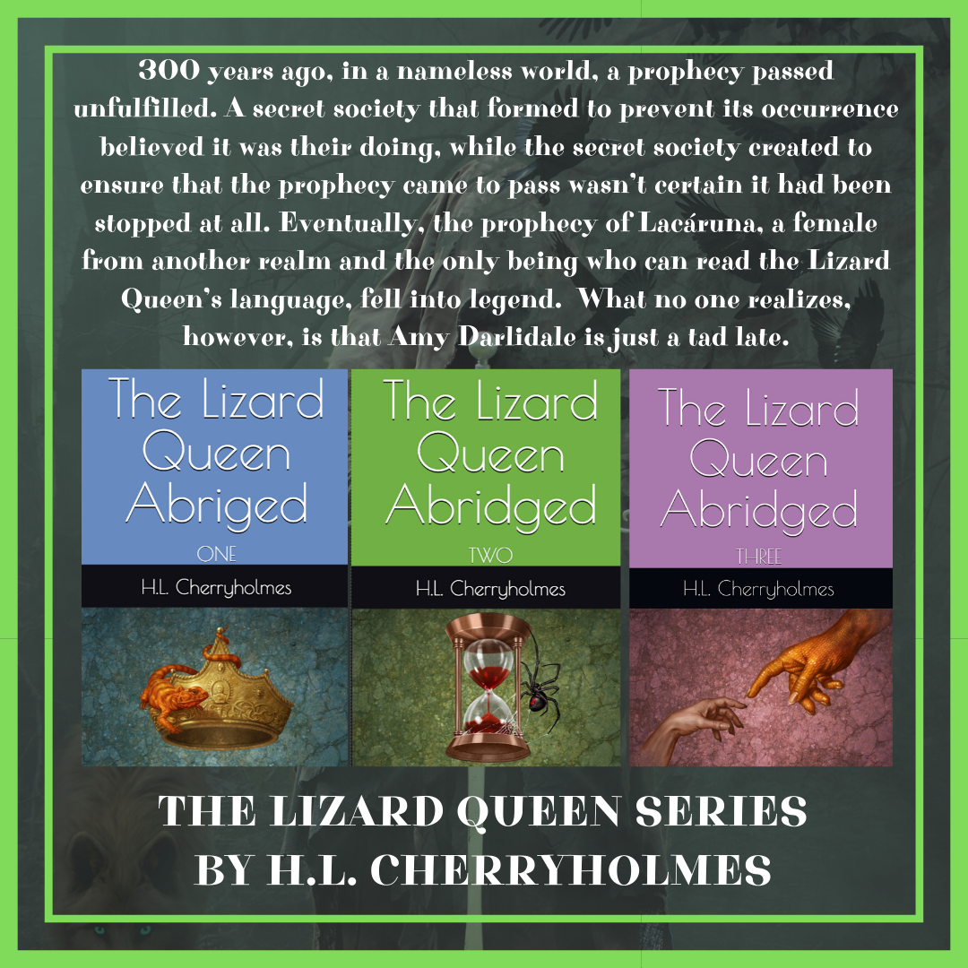 300 years ago, in a nameless world, a prophecy passed unfulfilled. A secret society that formed to prevent its occurrence believed it was their doing, while the secret society created to ensure that the prophecy came to pass wasn’t certain it had been stopped at all. Eventually, the prophecy of Lacáruna, a female from another realm and the only being who can read the Lizard Queen’s language, fell into legend. What no one realizes, however, is that Amy Darlidale is just a tad late.